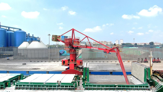 奧拓股份向菲律賓客戶提供的AOTUO輪胎移動式螺旋卸船機(jī)順利投產(chǎn)!AOTUO brand tire mobile screw ship unloader provided by HZAT to Phi...