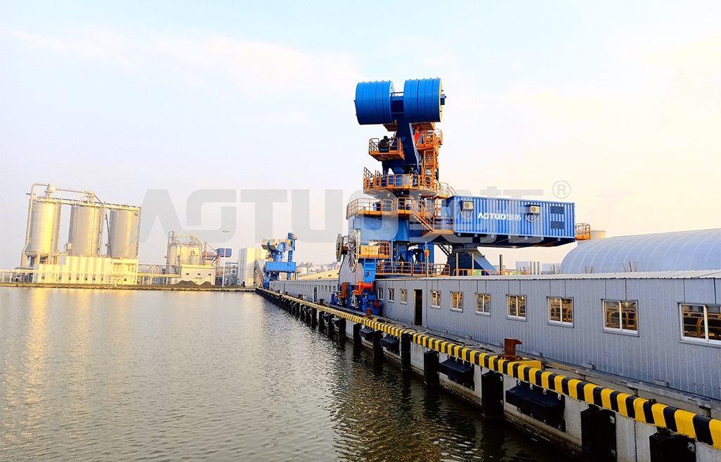 AOTUO-XM環(huán)保型螺旋卸煤機為奧拓股份2018年自主研發(fā),生產制造,并成功應用于國內某電廠輸煤系統(tǒng)。依靠回轉塔雙向水平旋轉、塔上水平梁仰俯變幅、垂直臂前后擺動及門機行走,取料器可實現(xiàn)三維運動跟蹤物料位置取料,進而利用垂直螺旋機將物料提升至水平螺旋機,再通過出料裝置自動將船倉內物料卸載到岸上的輸送系統(tǒng)。該機型優(yōu)點如下: