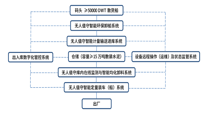 由無人值守智能環(huán)保卸船系統(tǒng)、無人值守智能計(jì)量輸送進(jìn)庫系統(tǒng)、無人值守庫內(nèi)在線監(jiān)測與智能均化卸料系統(tǒng)、無人值守智能定量裝車(船)系統(tǒng)、出入庫數(shù)字化管控系統(tǒng)、設(shè)備遠(yuǎn)程操作(運(yùn)維)及狀態(tài)監(jiān)管系統(tǒng)等六大分系統(tǒng)構(gòu)成。充分體現(xiàn)了環(huán)保型、無人化、智能化、信息化等。