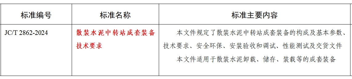 近日,工業(yè)和信息化部發(fā)布了2024年 第28號 公告,批準《制造業(yè)企業(yè)質量管理能力評估規(guī)范》等761項行業(yè)標準(其中建材行業(yè)標準54項)。由杭州奧拓機電股份有限公司主導,中建材(合肥)機電工程技術有限公司、浙江省散裝水泥發(fā)展中心、中國散裝水泥推廣發(fā)展協(xié)會、中國建材機械工業(yè)協(xié)會等八家單位參與研制的JC/T 2862-2024《散裝水泥中轉站成套裝備技術要求》建材機械行業(yè)標準在發(fā)布之列,將于2025年5月1日起實施。