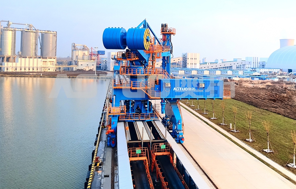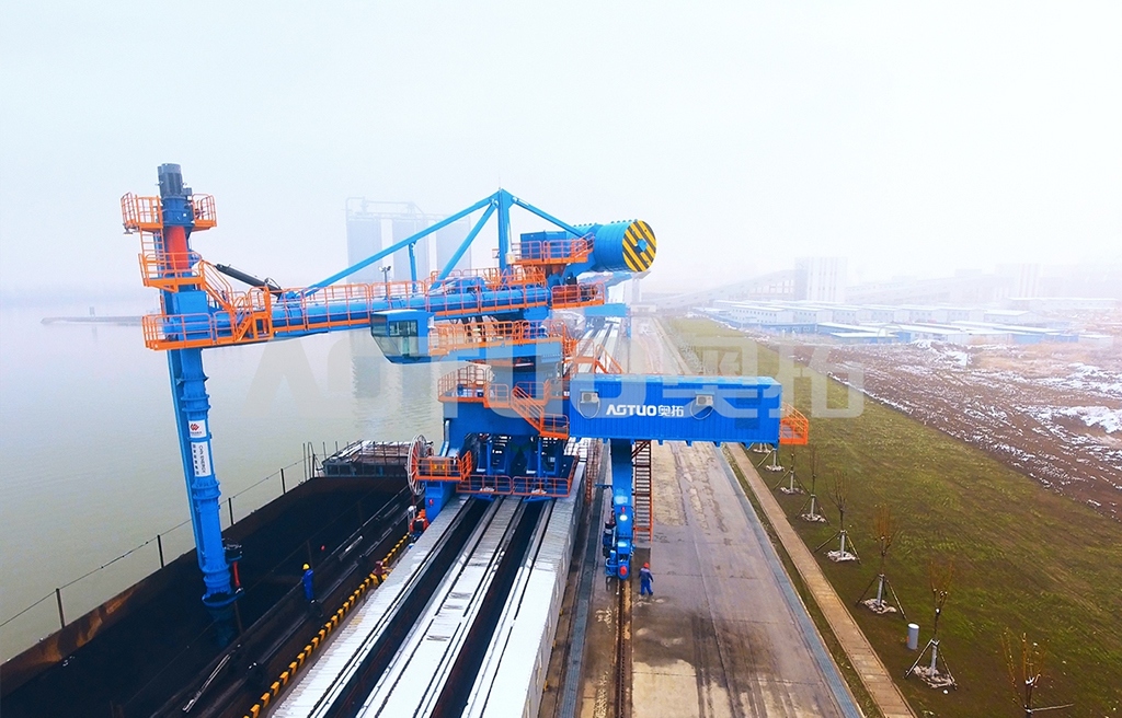 AOTUO-XM環(huán)保型螺旋卸煤機為奧拓股份2018年自主研發(fā),生產(chǎn)制造,并成功應(yīng)用于國內(nèi)某電廠輸煤系統(tǒng)。依靠回轉(zhuǎn)塔雙向水平旋轉(zhuǎn)、塔上水平梁仰俯變幅、垂直臂前后擺動及門機行走,取料器可實現(xiàn)三維運動跟蹤物料位置取料,進(jìn)而利用垂直螺旋機將物料提升至水平螺旋機,再通過出料裝置自動將船倉內(nèi)物料卸載到岸上的輸送系統(tǒng)。該機型優(yōu)點如下:
